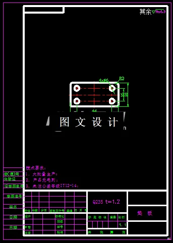 此零件是个平板垫片,零件的外形是规则长方形,四角圆弧过渡,内部有四个圆孔,对角分布成对称,通过计算排样图和模具刃口尺寸,外形尺寸等,选择标准模架,并计算冲压力大小,选择合适的压力机,利用软件绘制模具图纸。