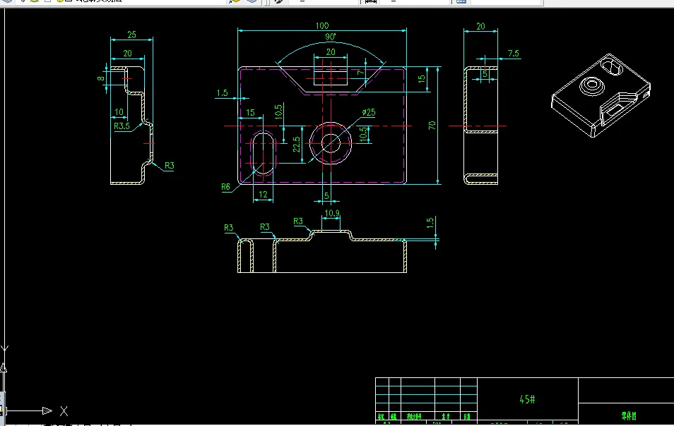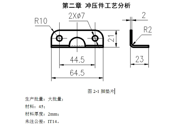 此门锁板零件,通过测绘实物,获得零件图,并结合图纸形状,分析冲压工艺,基本工序有落料,拉深,冲孔。工件的外形成盒形结构,通过详细计算展开尺寸,获得毛坯尺寸,绘制图纸,并设计排样图,计算模具的各个尺寸,绘制模具装配图和零件图,记录计算结果,校核压力机的型号。