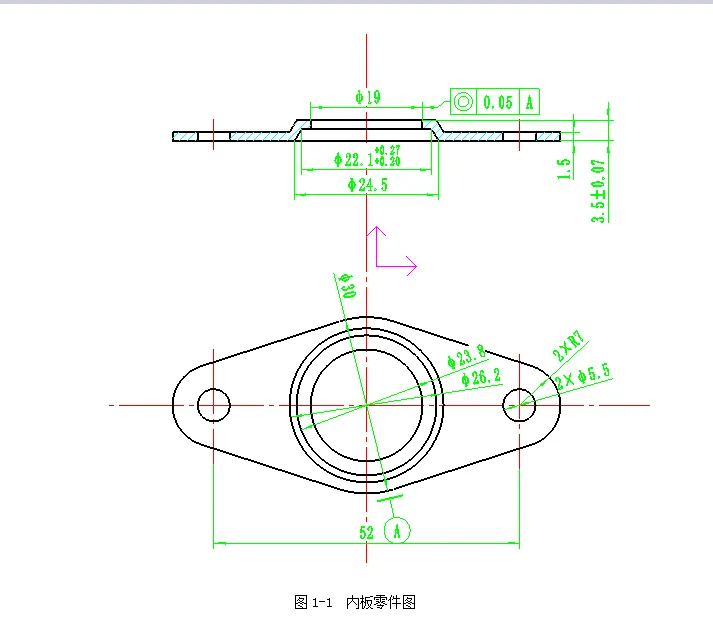 此弹簧座,典型的凸缘结构拉深件,虽然凸缘直径不大,但是还是需要通过详细计算展开尺寸和拉深系数,确定拉深工序尺寸,根据要求设计其中二次拉深工序的模具结构,计算模具的外形尺寸和刃口尺寸,绘制模具图纸。