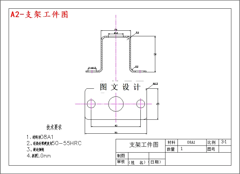 本次设计,是针对连接板,进行冲压工艺及模具设计。采用落料、冲孔工艺。设计中分析了工件的冲压工艺性,计算了毛坯排样、冲压力、刃口尺寸计算等。进行了模具总体结构、主要零部件的设计和计算,绘制了落料、冲孔复合模的模具装配图和零部件图。
