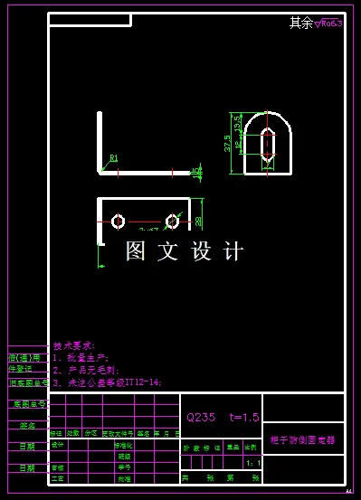 该柜子防倒固定器零件,是一个L形弯曲件,工件的一侧有圆孔,两头圆弧过渡,因此通过计算后,工件展开图形是以个规则形的平板,但是生产需求量比较大,因此要设计该零件的级进模,提高生产效率,因此本次设计一模出两件的结构,将切断载体设计在工件的中间,将工件弯曲成U形,然后中间切开成两件。设计这样的模具图纸。