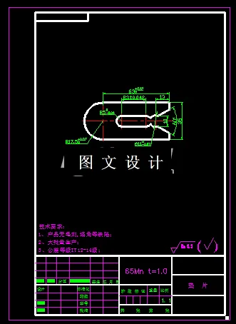 本次设计的垫片,外形不规则,单侧还有个很深的缺口,材料为65Mn钢,厚度t=1.0,此材料属于优质碳素结构钢,其抗剪强度 =600MPa,抗拉强度 =750MPa,屈服极限400MPa,通过对材料和工件形状分析,选择倒装模具结构设计。