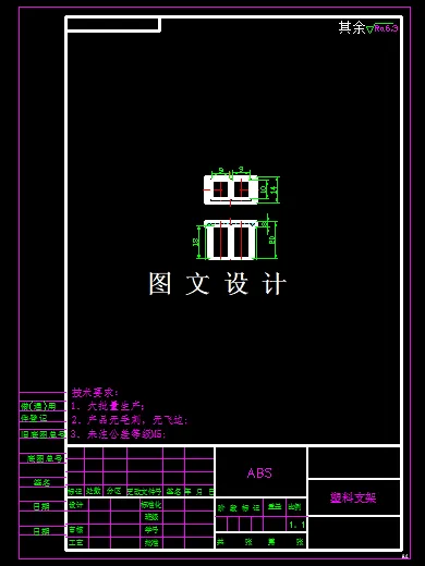 本次设计的塑料支架,形状简单,类似盒形零件,有两个矩形盒形,外形成矩形,因此模具结构比较简单,直接设计两板模,通过详细计算后,设计出合理的模具结构和非标零件图。