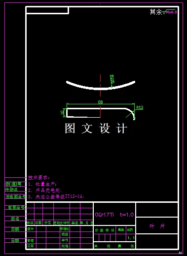 该工件的加工涉及到落料、弯曲等多个基本工序内容,从产品外形尺寸分析,该产品尺寸很小,形状规则,都是直线、圆弧过渡,为方便设计模具,落料时直角尖角处建议增加圆角过渡,本次设计只是设计其中的弯曲模。