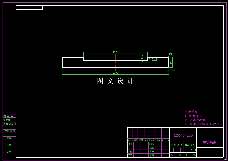 本次设计的垃圾桶盖零件,基本工序有落料,然后拉深,冲孔,翻孔,外形为典型的直筒形拉深件,拉深后的切边余量通过侧滑切边或者机加工,保证零件高度,本次设计需要设计级进模,就需要将工件改制成带凸缘的形状,然后把凸缘齐边切除,如此,切边整齐,模具加工简单,产品高度保持稳定。