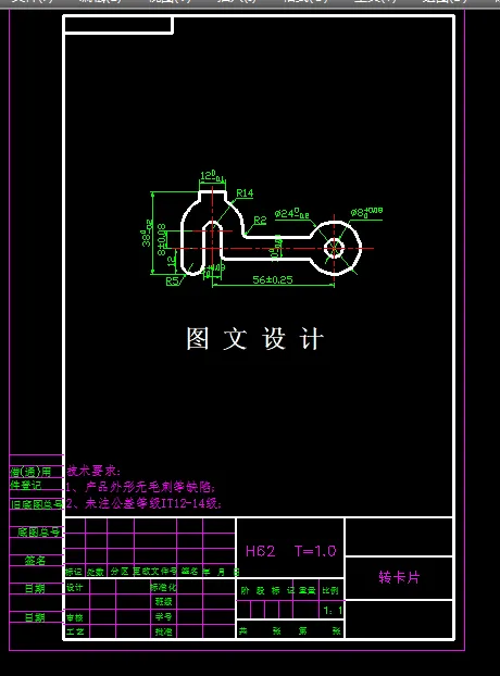 由制件零件图可以知道:制件的外形不规则,尺寸中等,一头大一头小,属于T形零件,产品中间有1个圆孔,孔与外形分开的话需要多次冲裁才能完成加工。通过对零件的初步分析可知,要完成该制件的生产,需要经过以下工艺:冲孔、落料。由于其形状较复杂,为达到一定的生产效率,满足年生产量,我们设计生产效率高的级进模来完成此制件的生产。