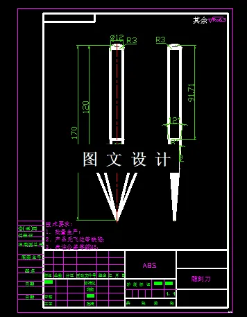 本次设计是雕刻刀注塑模具,这种雕刻刀是非常普遍的塑料产品,也是日常家庭必备的一种,以及公共场所中随处可见,该零件属于外观塑件,需要有较好的强度。分析塑件要求,本次选取性能较好的ABS材料,需对本次雕刻刀进行工艺分析,选取合理的模具结构,对成型零件做出尺寸计算,绘制模具结构图,零件图,3D图,编制设计说明。