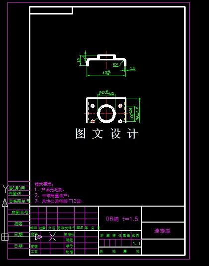 此制件的形状较简单,两侧为U形弯曲,中间有翻孔,在设计模具之前,首先要对工件进行简单的计算,计算展开尺寸和翻孔的预孔直径,通过工艺计算,计算好后绘制出展开图,根据展开图的形状,绘制出合理的排样图,模具装配图,零件图。
