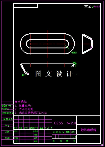 本次课题如图,拉深高度尺寸小,且四周有R角过渡,形状较简单,且对称,便于模具的加工,本次课题拉伸高度达到21mm即可,且四周有锥度,所选材料为Q235钢,属于普通碳素钢,其抗拉强度为380-470MPa,抗剪强度为310-380MPa,屈服极限240MPa,延伸率21%,从材料性能分析,该材料适合做冲压件。