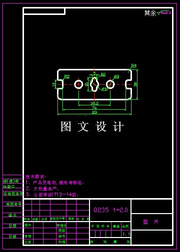 本次设计的课题名称是垫片,利用UG软件进行三维模具设计,工件形状比较规则,中间有三个孔,且都是对称的零件,工件四周有R角过渡,所以这类零件很适合用冲裁的方式实现。