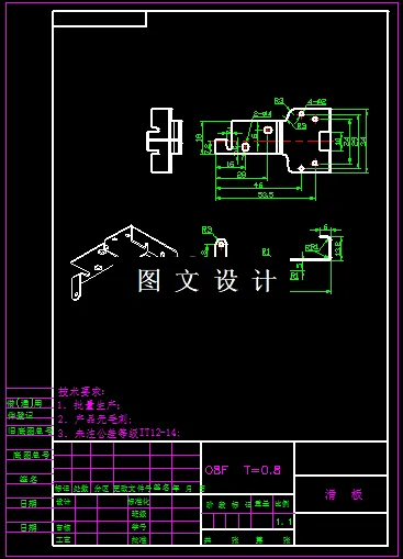 产品所用的材料为08F,其力学性能如下:τ=220~310Mpa,σb=280~390 Mpa, σs=180Mpa。(《冷冲压工艺与模具设计》P322),零件图上未注公差等级,属自由尺寸,按IT12级确定工件尺寸的公差.该制件形状简单,尺寸较小,厚度一般,属于普通冲压件,
