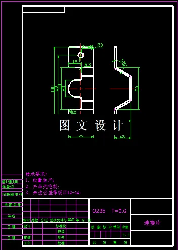 该件为带圆孔的方形零件,尺寸精度要求不高,由冲裁和弯曲即可成形。冲压难点在于多道工序在一副模具里实现,即采用连续冲压的方法,同时要保证产品不能变形。同时为模具收力均匀,最后切断的方法,这样既能提高生产效率,有能使模具稳定,沿长模具寿命。