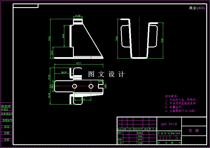 由于是中批量生产,单工序模具成本低,工序多,周转也困难,而且此形状又不适合于级进模,过测量和计算,孔边到外形的最小距离是10.9mm,而材料厚度为1.5,所以此边到边的距离应超过1.5t=2.25才能一起冲,所以符合复合模设计原理,经过以上分析,最终确定只能选择三副模具,虽然工序多,周转困难,但符合设计要求和原理。 产品材料为Q235钢,属于普通碳素钢,厚度也属于一般的冷轧碳素钢薄板及钢带,抗剪强度310-380MPa,抗拉强度380-470MPa。709034