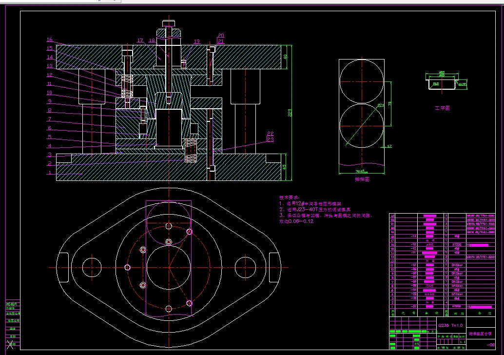 本次课程设计的内容是用模具生产轴承座,并且制定出相关的工艺路线,设计出生产所用模具。工艺路线主要包括落料、拉深两道工序,设计为落料拉深复合模具。冲压工艺的选择是在查阅了相关资料和对产品外形成尺寸进行了仔细分析的基础上制定出来的;冲压模具的设计综合考虑了经济性、零件的冲压工艺性和复杂程度等诸多因素;产品毛坯的展开尺寸计算是在方便计算又不影响零件成型的前提下转化为熟悉的模型进行的。模具的主要部分零件给出了相应的尺寸计算,同时给出了详细的零件结构设计,并附有相应的零件图,最后根据零件结构设计和生产零件的要求生成了总装配图。