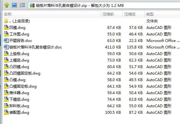 此倒装式复合模具的设计,包含:1、首先对零件的工艺性进行分析,然后选择了几个可行方案,接着对工艺方案进行演算和比较,最终确定采用倒装式复合冲裁模,2、制定工艺流程,选择排样图,对材料的利用率进行计算,3、初步确定冲模结构,包括:(1)模具的具体形式(2)定位装置(3)卸料装置(4)导向零件(5)模架4冲裁力计算5、模具刃口尺寸的计算6、冲裁模具主要零件的设计及计算,包括:(1)落料凹模(2)冲孔凸模(3)凸凹模7、标准零件的设计及计算,包括(1)模架(2)导柱、导套(3)上、下模座(4)卸料螺钉8、其它支撑零件,包括(1)模柄(2)固定板及垫板9、紧固件的选择。