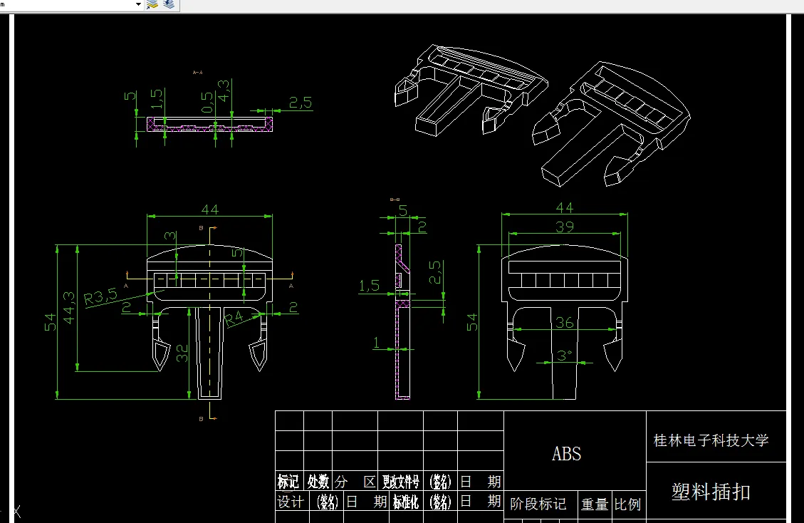 本论文首先对塑料插扣的材料、工艺和结构等进行分析,使用的是无毒无公害的ABS材料,此塑胶件外廓规格还算为家常所见中相比下,属于小型规格的零件。在类型方面它属于普通物品,可随处可见,消耗使用量超大的一款塑件制品零件。然后确定分型面。通过cad设计草图,同时确定浇注系统和模具成型零部件,综合塑料插扣的特点,采用侧浇口的浇口方式。另外,通过查看塑件底部结构,确定脱模所需的推出系统。然后,选择注塑机,并对最大注塑量、锁模力、模具安装尺寸等进行了校核。
