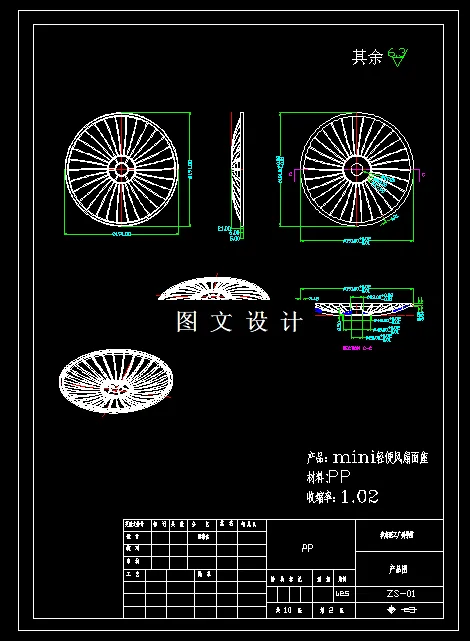 mini轻便风扇面座注塑模具设计 提供三维(三维有UG8.5格式+STP通用格式)+二维装配图及主要零件图,此次设计是对于mini轻便风扇面座进行模具设计,基于UG软件对塑件的三维建模,完成了对该塑件的结构分析,了解到该塑件外形结构较简单,中心上方有一个圆口,能在圆口上进胶。考虑模具尺寸与效益问题,我采用一模一腔结构,侧浇口进料的两板式模具。 通过对塑件材料的成型工艺的正确分析,所以选择了较理想的注塑机及对有关注塑机参数进行了校核。然后是塑模中的分型面的选择。对浇注系统的设计,确定了主流道,分流道,浇口及冷料穴等。然后是成型零件的设计及尺寸计算,我确定了型腔深度,型腔高度,型腔壁厚,型芯高度。然后是冷却系统的设计及计算,确定了是否需要冷却系统等,最后是对推出机构的设计,合模导向机构的设计以及对抽芯机构的设计等。一些重要的机构系统设计完成后,我会确定了模架。最终设计出了一模一 腔结构,侧浇口进料的两板式模具。