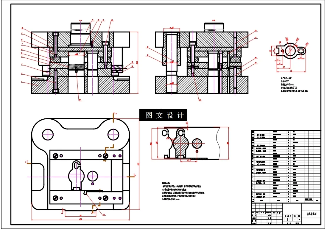 从冲裁工件结构分析,该工件轮廓结构由直线圆弧相切,工件形状具备对称性,工件工艺由落料和冲孔工序组成。模具的设计的设计先从工件的工艺结构出发,根据工件图纸要求和形状来确定模具的设计方案,进步一确定模具制造精度等级,和排样设计从而确定出模具的类型结构,从实际生产的角度出发,为了节约模具制造成本,提高产品生产效率,保证工件的生产精度,该工件的冲裁模具设计方案采用了级进模具冲裁。在模具设计前主要查找工件图纸中未标注公差的尺寸公差,根据尺寸公差来确定模具制造的精度,经过排样分析以后,开始进行模具的结构设计,计算模具的闭合高度、卸料力、冲裁力、冲裁间隙、模具装配配合间隙、凸模高度、压力中心、模具总压力,根据总冲压力选择冲压设备;所有的设计方案确定以后开始绘制模具草图、装配图、零件图、编写技术要求、设计说明书。