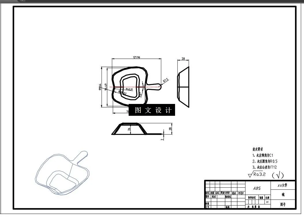 本文研究的是碗的注塑成型。首先分析产品的成型工艺,然后根据产品结构,设计如何分型,及型腔数目,进胶方式。过程中要充分考虑到零件的加工方法,尽量简便精准,并进行相关尺寸的计算和校核,再设计浇注系统,冷却系统,排气系统,脱模机构,导向机构,以及模架的选择。通过CAD,UG ,等软件辅助分析设计是否合理,选择合理的工艺参数和设计方案。