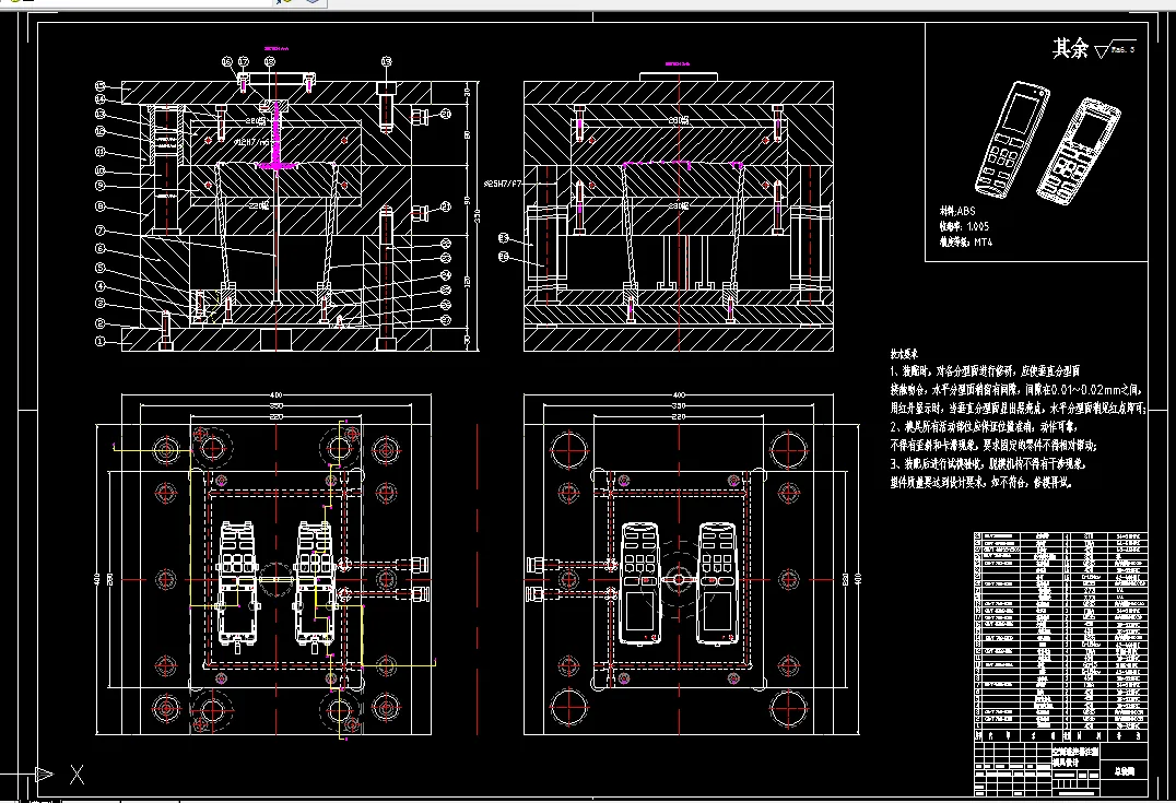 本文介绍了空调遥控器的相关内容。第1章简要介绍了塑料模具的基本概念、国内外的发展和注塑模具的选题意义。第2章围绕零件设计和注塑成型分析展开,分别从零件的结构分析、材料选用、体积和质量等方面进行详细阐述。第3章介绍了模具型腔布局及浇注系统设计的相关内容,包括模具结构特点、浇注系统的排布和优化等。第4章主要是关于模具成型零件的设计和计算,包括模具的压力计算、合模力计算等方面。第6章介绍了模具推出脱模系统的设计,包括模具推出脱模系统的形式和结构设计等。第7章介绍了注塑机选择和模架选择校核的相关内容,包括如何进行注塑机选型和模架选择、如何进行校核和计算等。本文全面而详细地介绍了空调遥控器的相关内容,具有一定的实用和指导意义。