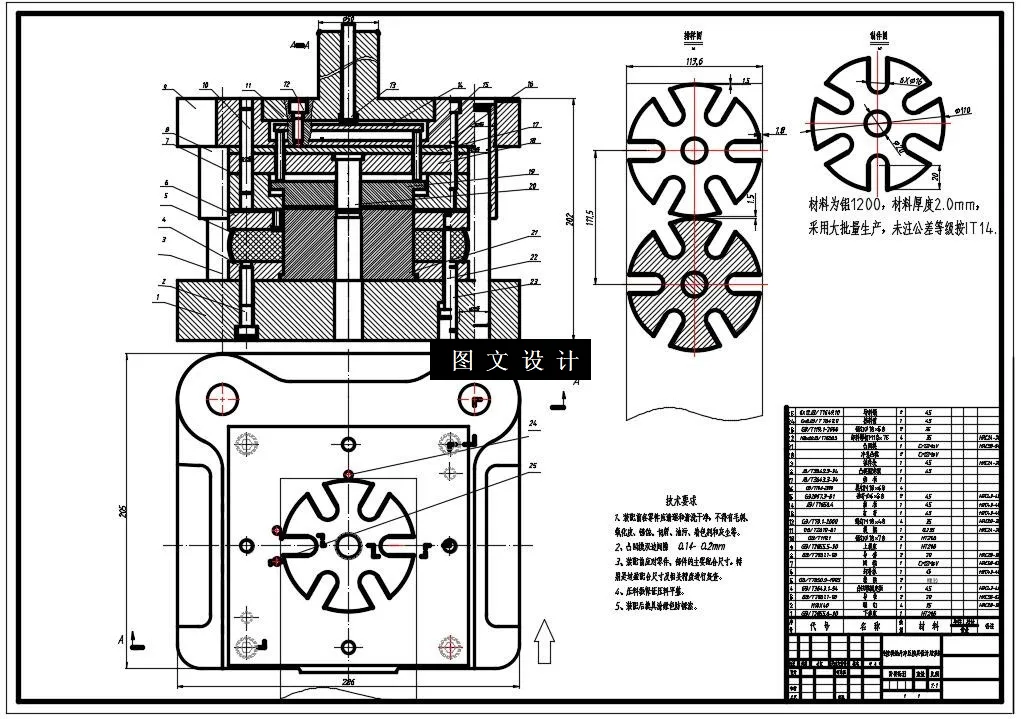 本文对垫片复合冲压模具进行简单的分析,根据毛坯的几何形状要求、材料和尺寸的分析得出冲裁排样设计图、凸模、凹模和凸凹模的结构,采用倒装式复合模冲压,有利于提高生产效率,降低成本、缩短制造周期,模具设计有一定的难度。工艺分析结束后,进行主要零件尺寸的计算,包括凸、凹模以及凸凹模刃口以及毛坯尺寸的计算,然后选取冲压设备,接着是主要零部件的设计和选取,最后进行压力机的校核,采用CAD软件绘制冲压模具工作零件的零件图,绘制垫片倒装复合模的零件图和装配图。