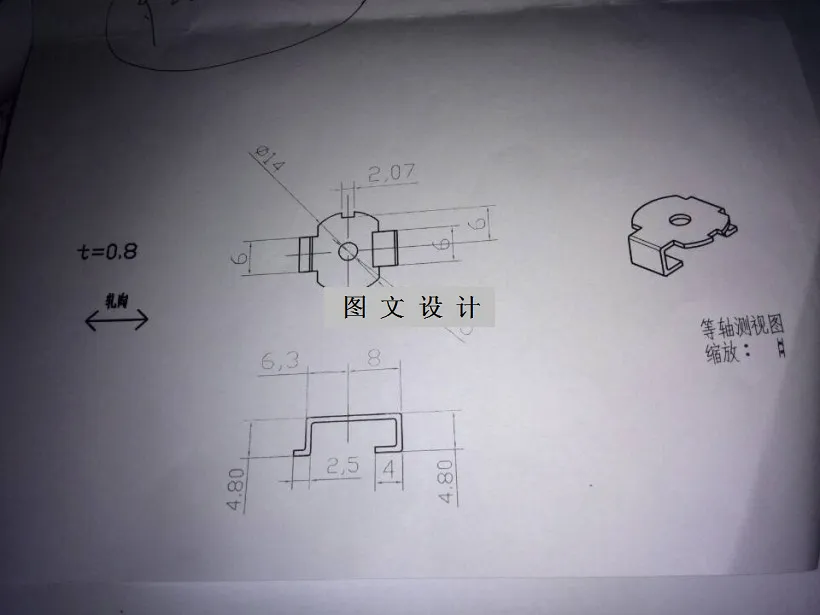 从冲裁工件结构分析,该工件轮廓结构由直线圆弧相切,工件形状具备对称性,工件工艺由落料和冲孔工序组成。模具的设计的设计先从工件的工艺结构出发,根据工件图纸要求和形状来确定模具的设计方案,进步一确定模具制造精度等级,和排样设计从而确定出模具的类型结构,从实际生产的角度出发,为了节约模具制造成本,提高产品生产效率,保证工件的生产精度,该工件的冲裁模具设计方案采用了级进模具冲裁。在模具设计前主要查找工件图纸中未标注公差的尺寸公差,根据尺寸公差来确定模具制造的精度,经过排样分析以后,开始进行模具的结构设计,计算模具的闭合高度、卸料力、冲裁力、冲裁间隙、模具装配配合间隙、凸模高度、压力中心、模具总压力,根据总冲压力选择冲压设备;所有的设计方案确定以后开始绘制模具草图、装配图、零件图、编写技术要求、设计说明书。