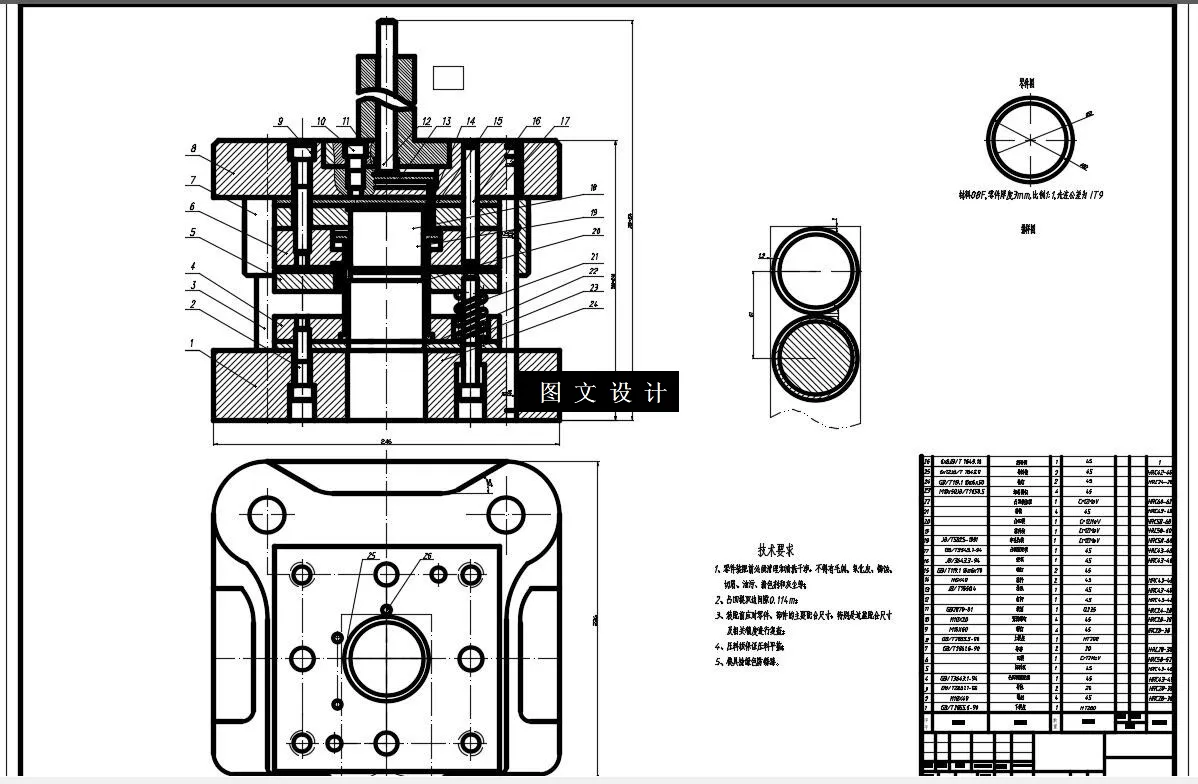 该冲裁件包括落料和冲孔两个基本工序,可采用的冲裁方案有单工序冲裁,复合冲裁和级进冲裁三种,零件属于大批量生产,因此采用单工序需要模具数量多,生产效率低,费用高,不合理。如果采用级进模,需要较多的工位数,必须解决板料的准确定位问题。采用倒装复合模可以一次冲压成形,结构较为简单,卸件可靠,操作方便。根据以上分析,该零件比较适合采用倒装复合冲裁工艺方案。
