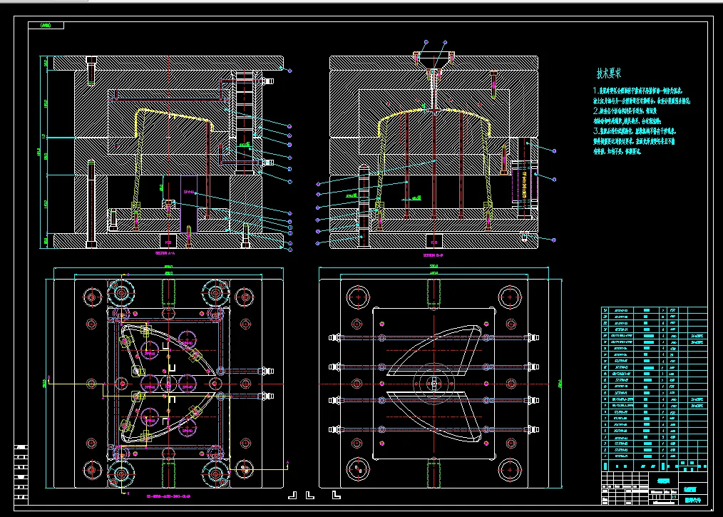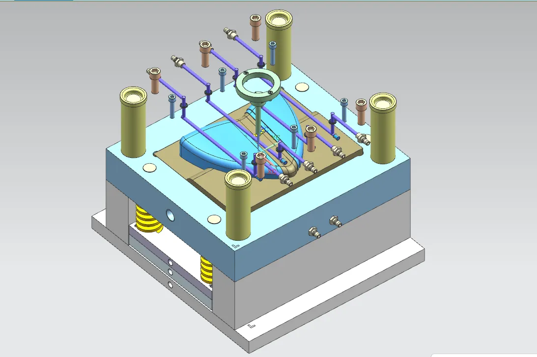 分析完产品本身以后首先需确定该产品的分型面,这一步至关重要,通常采用产品最大端面处为分型面。然后再用UG测量出该产品的最大尺寸多少,结合实际确定出一模几腔满足实际加工要求,经过综合分析为一模两腔的型腔布局,布局规则和均匀,然后选择合适的模架即可。流道尽可能的设计在塑件中间,保证其良好的充填性,本次采用直接浇口转侧浇口。本次设计的产品难度和结构一般,就利用分型面自然排气,不用单独设计排气系统。再者,水道也要设计得均匀的冷却产品,不可离流道太近,再者就是水道和产品距离需要大于5mm。本次设计顶杆分布均匀顶出塑件,可以在塑件脱模之后的质量得到保证。设计完了以后就对模具进行参数校核,然后确定各个结构之间配合是否符合设计要求,对比,不符合要求的微作调整。然后检查完成以后就导出二维图在CAD里面进行标注,整理图档。