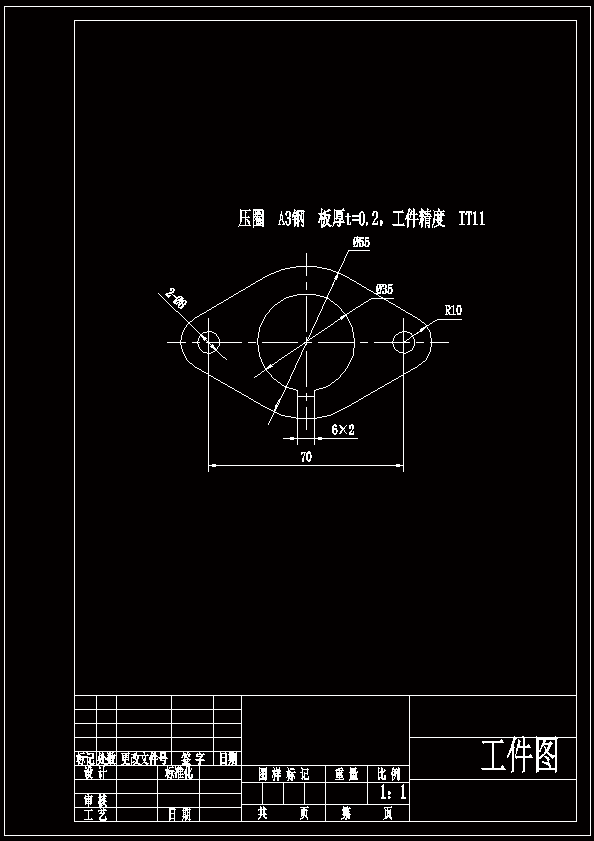 零件结构形状相对简单,无尖角,对冲裁加工较为有利。零件中有2个小孔一个大孔,孔的直径最小尺寸为8mm,孔离工件边缘的距离最小为6mm。根据该零件形状来分析,该零件的结构满足冲裁要求。