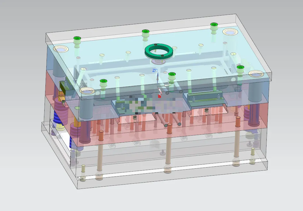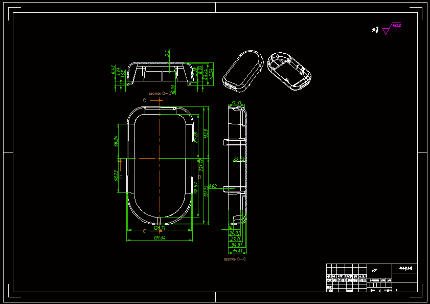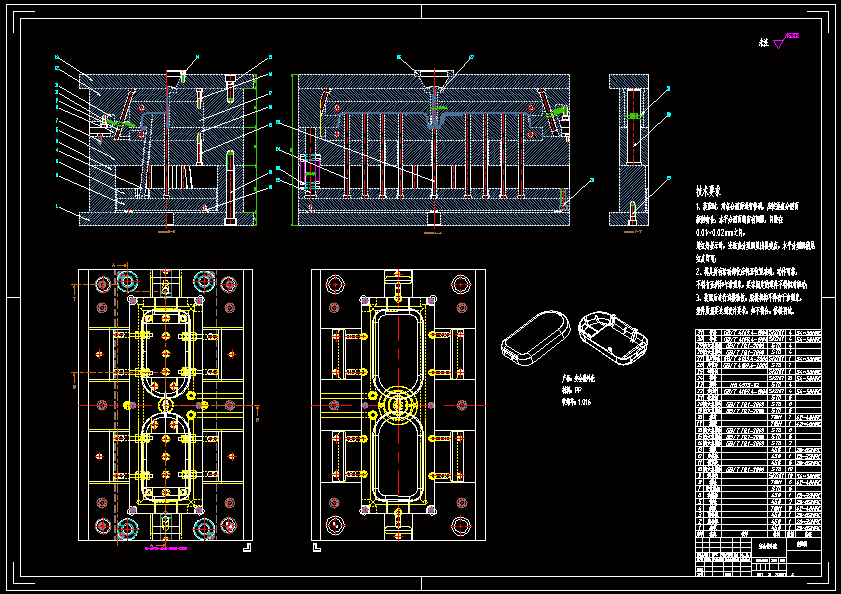 安全带外壳注塑模具设计 因为塑件结构比较简单,尺寸较小,结构较为复杂,考虑实际生产效率的需要,使用一模二腔,并最终使用 AutoCAD、UG设计软件,完成模具装配图方案的三维设计,并绘制注塑模具 总装图及相关零件图。