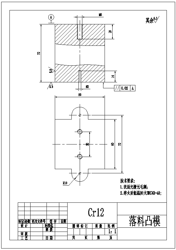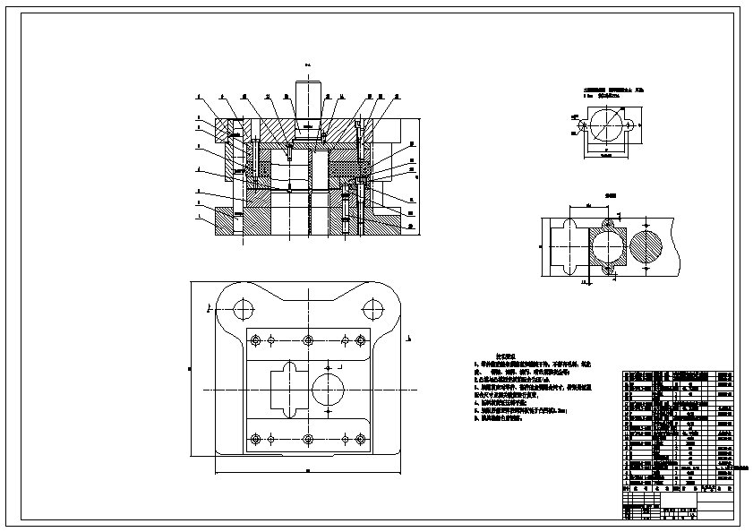 钛合金水泵连接垫圈垫片单排级进模具设计 水泵连接垫圈具有直线和圆弧构成的简单外形,上面有一个大圆孔和2个小圆孔。外形依靠落料完成,冲孔依靠冲孔工序来完成。模具刃口计算后,就是模具的结构设计,先进行凹模外形尺寸的计算的通过凹模的外形尺寸来得到模具中其他固定板、卸料板等的尺寸,最后选择模架等一系列标准件,最终完成模具的设计。