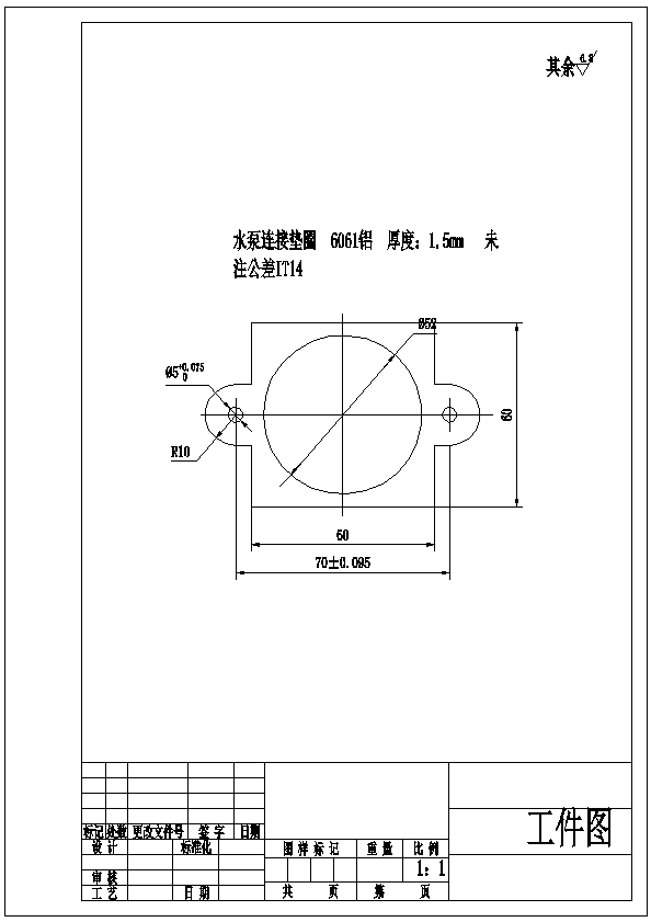 水泵连接垫圈冲压模具设计 需要对水泵连接垫圈进行详细的分析,分析一般包含三个方面,分别是材料分析,结构分析和工序分析。该工件水泵连接垫圈材料为6061铝,属于常用的钣金类材料,冲压性能比较好,结构上总体来说结构基本属于对称,厚度是1.5mm,水泵连接垫圈的整体外形规则,工件外形基本都是直线和圆弧过渡,。水泵连接垫圈主要有落料、冲孔的工序,可以采用级进模完成,由于多个工序同时完成,可以保证高的生成效率,同时还能提高工件的质量。