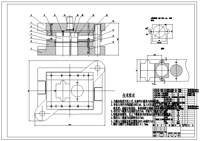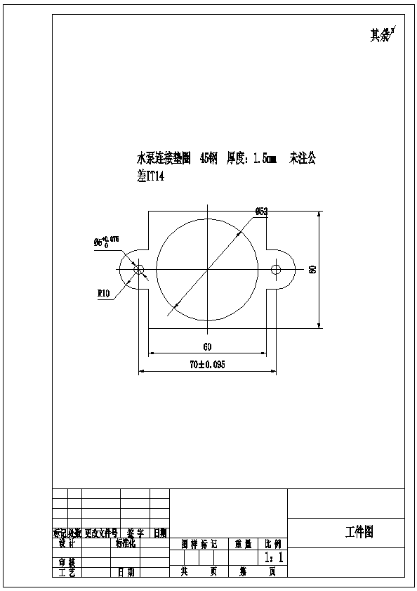 45钢制水泵连接垫圈垫片单排级进模模具设计 结合现有的模具发展技术以及冷冲压技术,针对要设计的水泵连接垫圈零件级进模设计。确定冲压方案后进行带料排样方案的选择与设计,冲裁工艺计算。在此基础上制定了零件的加工工艺,正确卸料方式及级进模的总装结构设计,各部分零件设计以及压力机的选择。