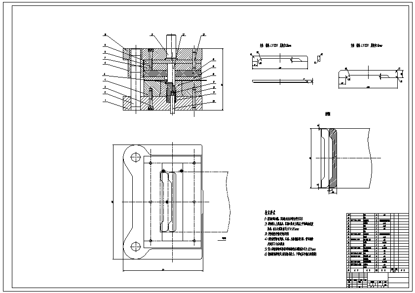 支架零件复合模具设计 本设计是对支架的落料、翻边复合模的设计,完成的内容为:对模具在工业生产中的作用,模具发展历史与现状,未来模具的发展前景做了概述。进行零件的形状、尺寸、精度工艺分析,确定合理的工艺方案,确定工序数目。确定毛坯尺寸,判断能否一次拉成,合理排样,绘制排样图,计算冲裁力、推件力、顶件力、卸料力、翻边力,确定压力中心。确定翻边凸、凹模间隙,计算落料、翻边、冲孔的凸、凹模刃口尺寸。确定凸、凹模结构,并绘制零件图,设计定位零件,压料、卸料、出件零部件,设计固定零件,选择模架标注紧固件。最后绘制模具非标准零件图,用CAD画出二维装配图。