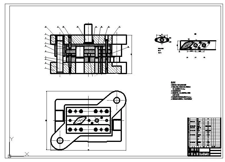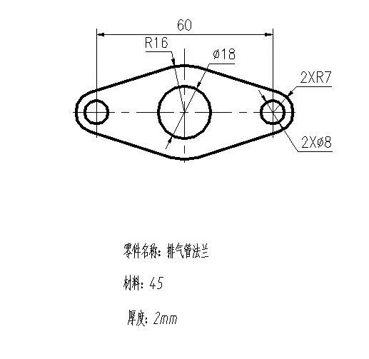 排气管法兰进冲压级进模设计 排气管法兰总体上下左右对称,厚度为2mm, 排气管法兰上有3个圆孔,对称分布。排气管法兰上的最小圆直径为8mm。所以排气管法兰可以采用较简单的级进冲裁模。