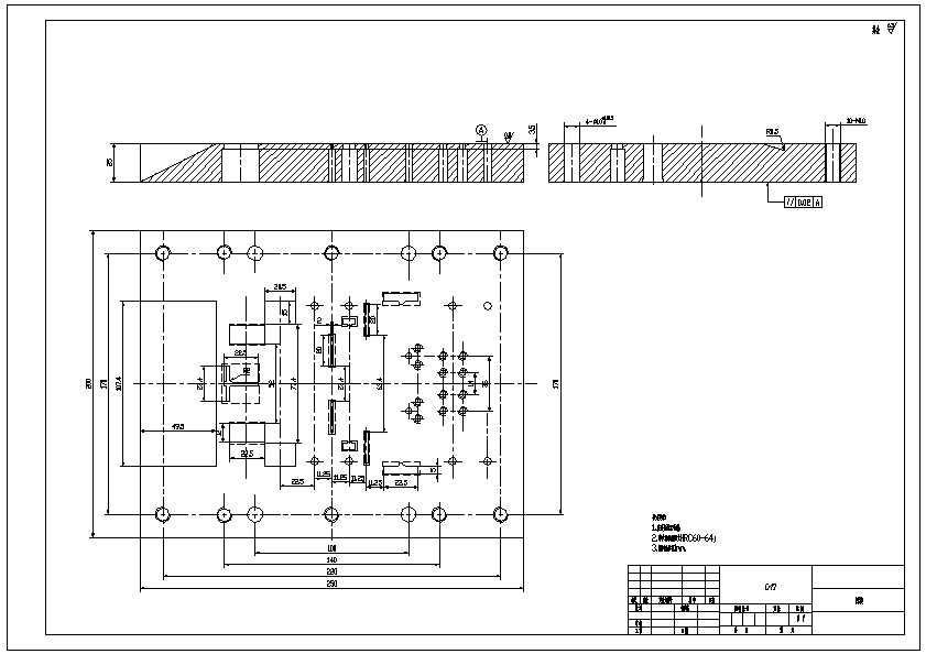 铁芯压板冲压级进模设计 使用级进模的方案最好,不但可以满足实际生产的需要,同时可以实现大批量生产。初步确定工件的生产工序为:侧刃定距冲孔、切边、弯曲、弯曲、切断。中间可以根据实际情况增加空工位。