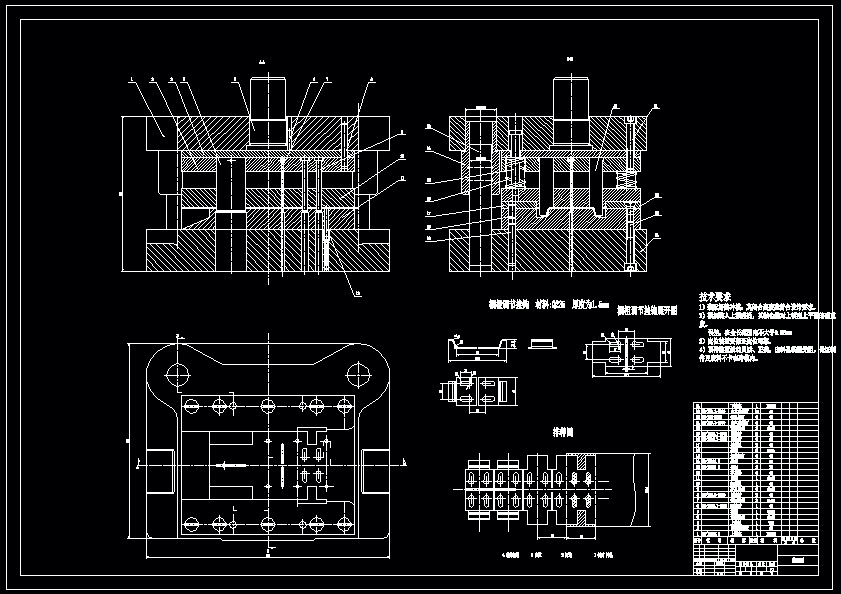 橱柜调节托钩冲压级进模设计 要对壁柜调节挂钩弯曲件的结构性、材料进行分析,选择合适的方式进行生产。材料的分析来确定工件是否适合生产。之后要通过工件的厚度来确定工件排样图的搭边,然后计算排样图的材料利用率。 接下来就是进行冲压力的计算,通过计算冲压力选择合适的冲压设备。模具刃口的计算也有其的重要,只有选择合适的刃口才能够确保模具的寿命,提高模具的使用率。 模具刃口计算后,就是模具的结构设计,先进行凹模外形尺寸的计算的通过凹模的外形尺寸来得到模具中其他固定板 卸料板等的尺寸,最后选择模架等一系列标准件,最终完成模具的设计。