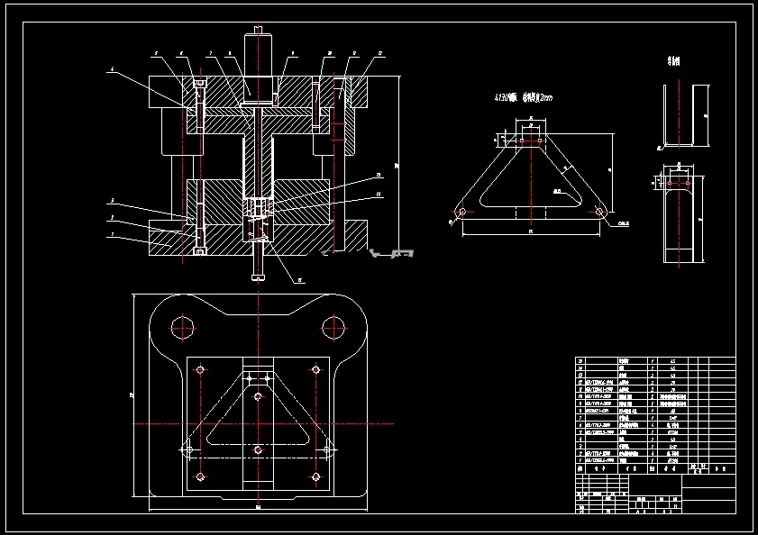 中央支架单工序冲压弯曲模设计 对中央支架零件进行工艺分析,了解材料的力学性能,并确定了冲压工艺的方案。设计的过程中,首先确定了弯曲力和冲压设备、弯曲模工作部分尺寸,采用U形弯曲的方法。确定模架的选择及主要零部件的结构设计。