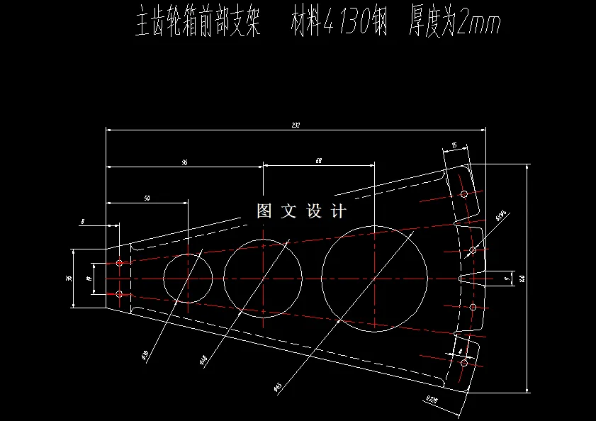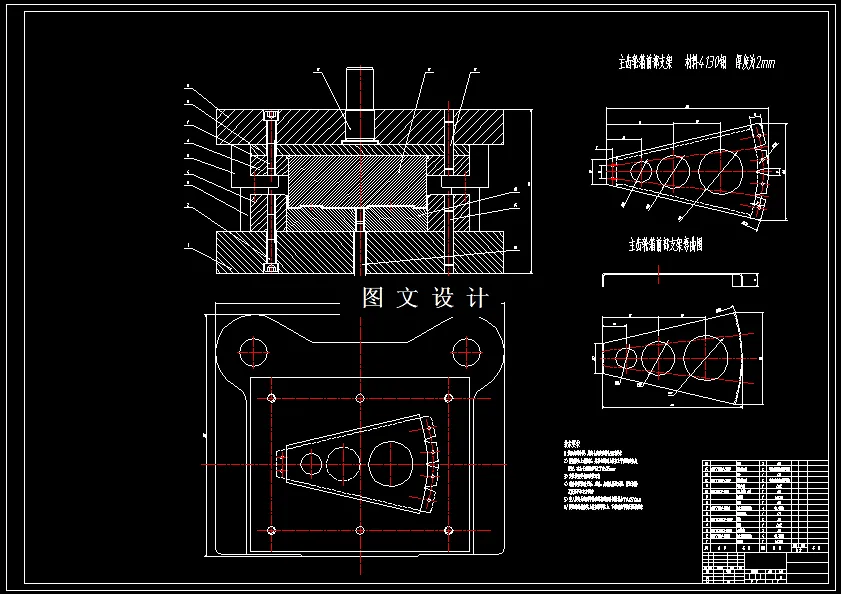 主齿轮箱前部支架弯曲模具设计 本次设计的工序是弯曲冲压工序的模具设计,完成工件的最终弯曲。含7张CAD图纸。autoCAD2007版本格式。该零件结构较相对简单、形状对称,属于中等冲裁件。