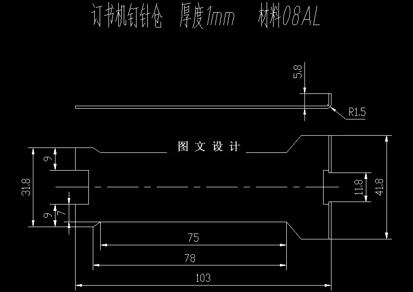 订书机钉针仓零件落料弯曲冲压工艺分析与模具设计 订书机钉针仓的结构相对比较简化,外形为直线和曲线结合,该零件进行冲裁生产能够满足实际的需要。