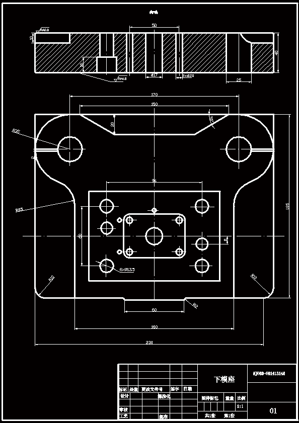 该零件的¢17mm的孔与外缘之间的最小距离为22mm大于此零件要求的最小壁厚,故可以采用冲孔,落料复合模或 冲孔,落料级进模。复合膜模具的形位精度和尺寸精度容易保证,且生产率高,尽管模具结构比较复杂,但由于零件的几何形状比较简单对称模具制造并不困难。级进模虽然生产率也高,但零件的冲裁精度稍差,要想保证冲压件的行为精度,需要在模具上设置导正销导正,故模具制造,安装较复合模复杂。通过对上述三种方案的比较分析,该零件的冲压生产采用方案三的复合模为佳。