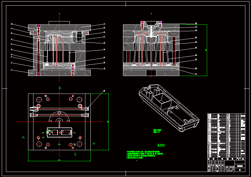 遥控器盒底塑料注射模具设计 根据塑件结构特点,模具采用单分型面注塑模,一模两腔,斜顶杆侧抽芯,顶杆顶出塑件,能够满足实际中大批量生产,有很高的生产效率。