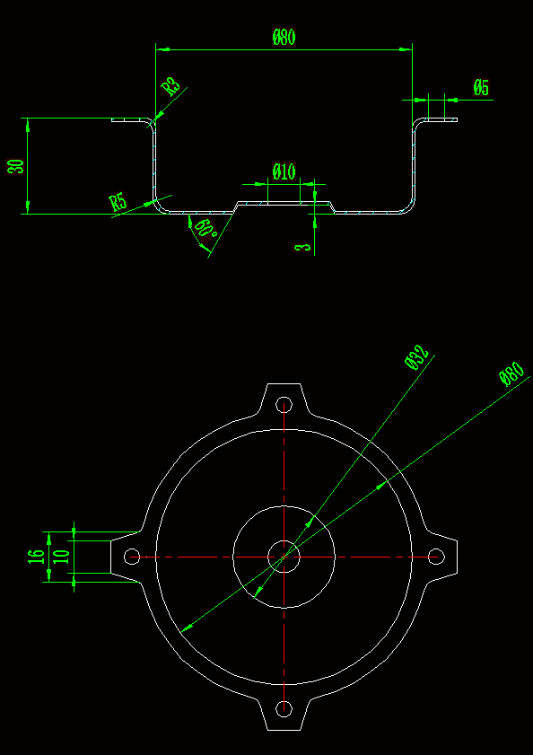 壳体件模具设计【冲压落料拉伸+冲孔】零件的功用与经济性分析: 此件为有缘桶形件,要求内形尺寸,没有厚度不变的要求。该件为对称件外缘弯角处R=3内部底部R=5并且关于中心对称。 该件材料为08号钢,该号钢的硬度适中,塑性和韧性好。其抗拉强度σb=324~441Mpa,在此选择 σb=325Mpa ,具有较好的冲压性能和力学性能,易于进行各类冲裁加工。
