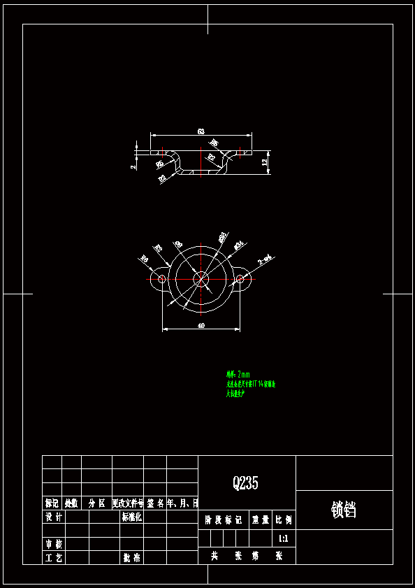 锁铛冲压模具设计零件材料为 Q235钢,要求使用冲压方式加工完成零件。 Q235钢含碳量低,强度低,塑性好,应用较广泛,可制作冲压件,如外壳,容器,罩子等。 本次设计的题目是:锁铛。 零件图如下: 材料:Q235,厚度t=2.0mm。