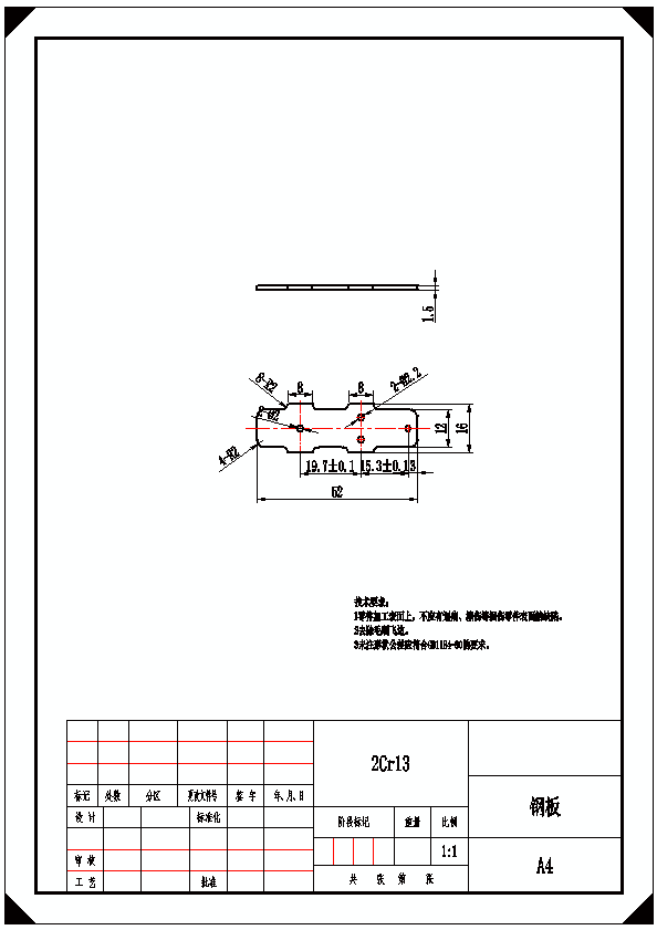 钢板零件级进模具设计本设计进行了冲孔、落料级进模的设计。文中简要概述了冲压模具目前的发展状况和趋势。对产品进行了详细工艺分析和工艺方案的确定。进行了凹、凸模的闭合高度的计算并确定了模具的结构。