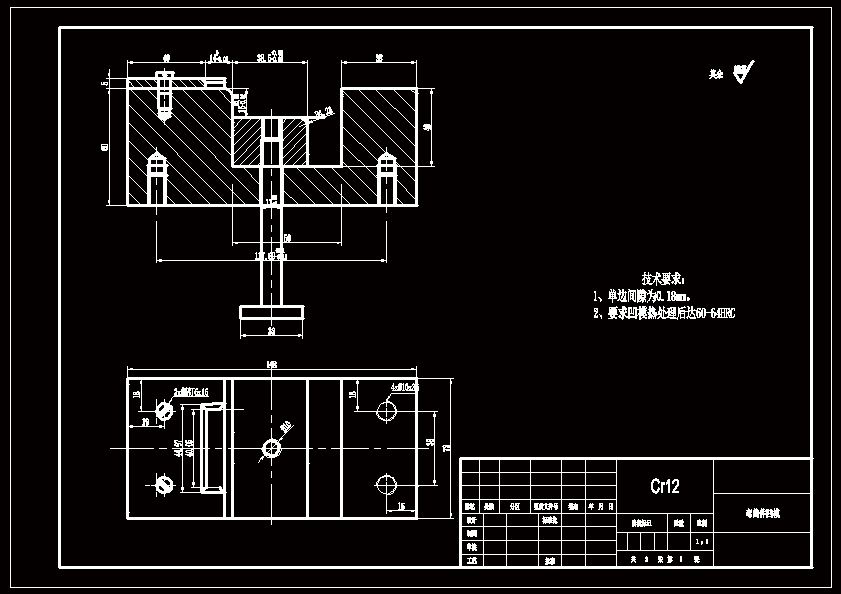 不锈钢弯曲件冲压模设计-直角板冲压模具设计 本文主要介绍了模具在现代工业中应用情况以及它的发展现状,发展方向。本设计以给定的零件来选择合理的模具,通过几种不同的模具比较最终定位采用复合模,工艺过程分为落料、冲孔、 弯曲成形,根据工艺要求确定了排样图,从而设计了凸凹模,确定各种力,确定模架查找标准件。最后一生产厂家和用户的角度对产品进行了技术经济分析。