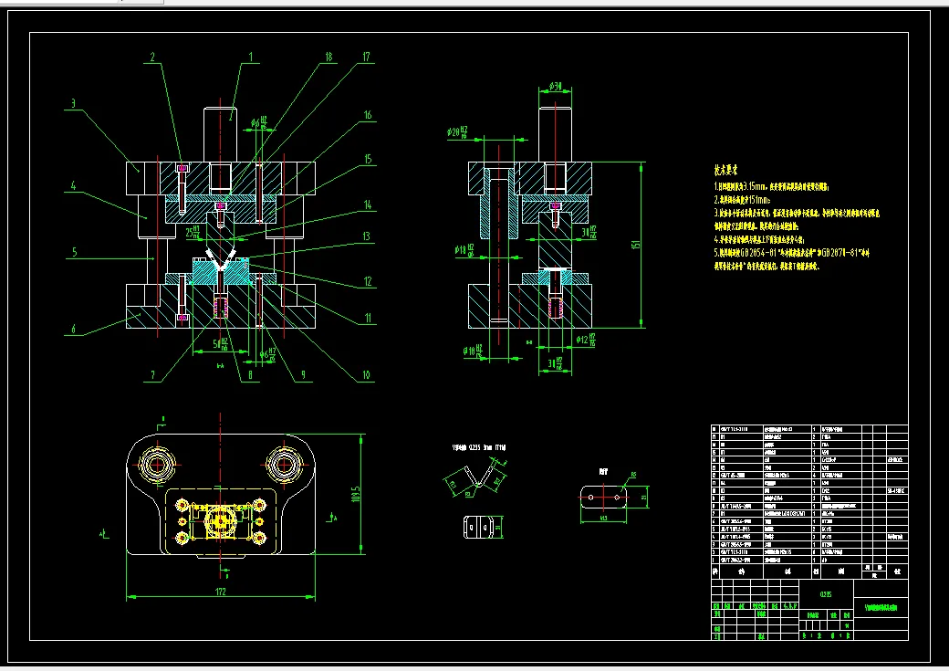 其次设计中还要考虑到它的实际工作环境和必须完成的设计任务,采用正装模,凹模型面采用数控线切割机床加工,在设计中我要考虑到很多关于我所设计模具的知识,包括它的使用场合、外观要求等,从这里可以知道模具设计是一项很复杂的工作,所以在设计要不断的改进直到符合要求。