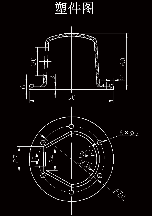 外罩的成型工艺及模具设计 本设计运用塑料成型工艺及模具设计的基础知识,首先分析了塑件的成分及性能要求,为选取浇口的类型做好了准备;然后估算了塑件的体积,便于选取注塑机;最后分析了塑件的特征,确定模具的设计参数、设计要点及推出装置的选取。 本塑件属于外罩壳体类零件,其一侧有一个长方形的侧孔,因此设计时必须有侧向抽芯。考虑到制件腔体较深,对型芯的包紧力较大,所以采用推件板推出结构,这种推出结构推出力大且均匀,有助于保护制件,非常适合在本副模具中使用。