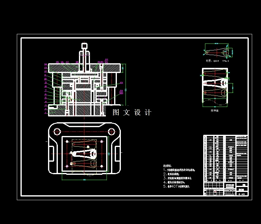 此设计为钣手冲孔落料复合模具设计(17170),采用冲裁材料为Q235,属于普通碳素钢,材料厚度:t=4.0mm,提供二维装配图1张及主要零件图11张+设计报告文档( 文档约1.3W字 35页)。本次设计是冲压模具设计,零件是有一个扳手零件,设计了一幅倒装式冲孔落料复合模,冲压工艺是冲压模具的选择,获取相关信息和形状的各个方面的分析;冲压模具的设计是一个物理产品映射,冲压工艺是冲压模具的选择,获取相关信息和形状的各个方面的分析;除介绍了冲压件和他与之有关零件的方式与采取道理,还介绍了此产品的毛坯外形的多种计算方式,以及开垦了毛坯计算尺寸大小的方法,简单明了这个模具的校核方式,并在冲压模具设计中参考了一些参考书。