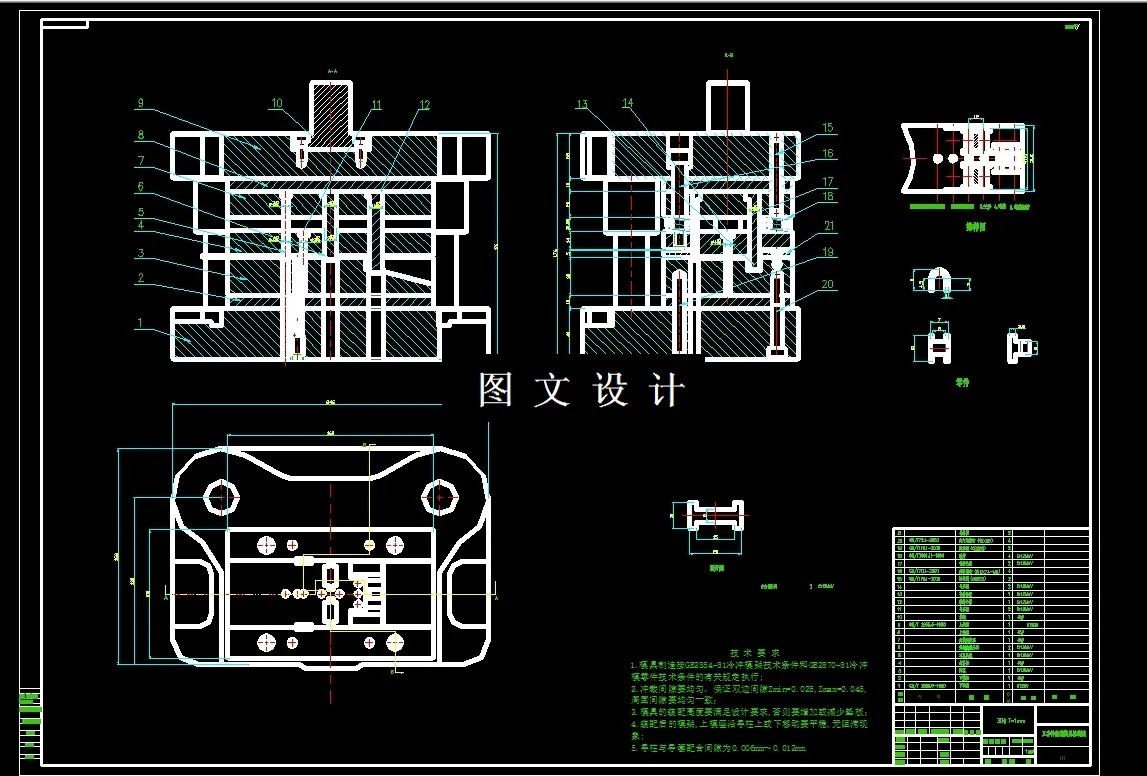 此设计为工字件冷冲压模具设计,材料为30钢,厚度1mm,提供三维(UG格式)+二维装配图1张及主要零件图13张